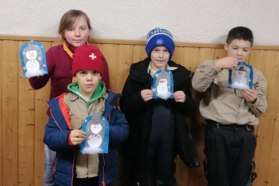 So traf sich die Meute Steinmarder, um gemeinsam kleine Weihnachtsgeschenke für die Eltern anzufertigen. Voller Eifer zeichneten die Kinder mit Schablonen Teile auf verschiedenfarbigem Karton auf und schnitten dann alles aus. Nun wurde gemalt, zusammengeklebt und mit Silbersternchen verziert. Und schon bald hatte jeder Wölfling ein wunderhübsches Fensterbild fertig vor sich liegen. Rasch wurden die Geschenke dann eingepackt, denn vor der Bescherung dürfen die Eltern das Geschenk natürlich noch nicht sehen!